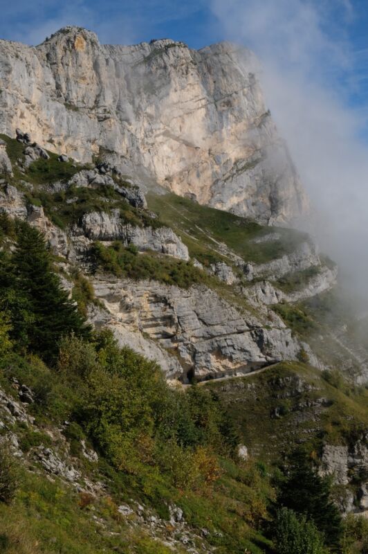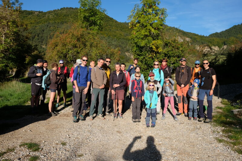 Samedi le groupe des familles de 5 adultes et 5 enfants pratique l’escalade tandis que le reste du groupe s’arrête le long de la route pour faire le Pic Saint Michel au départ du Pré du Four (+820m de D+) ou de Saint Paul de Varces pour les plus sportifs (1550m de D+) avec un déùarrage dans la brume, mais on trouvera le soleil au col de l’Arc avec une vue partielle au-dessus des nuages, et les 2 groupes de randonneurs se retrouvent au sommet pour manger.