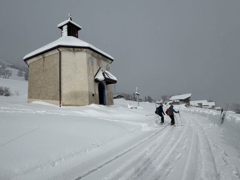 La route est bien enneigée pour arriver aux Chapelles (1290m) , il y a 35 cm de neige fraîche et dense au départ; .