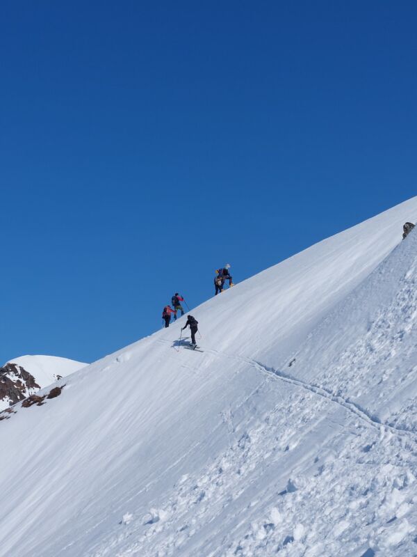 On monte à ski de manière plus ou moins continue jusqu’à 1250m, puis on ne quitte plus les skis jusqu’en haut.